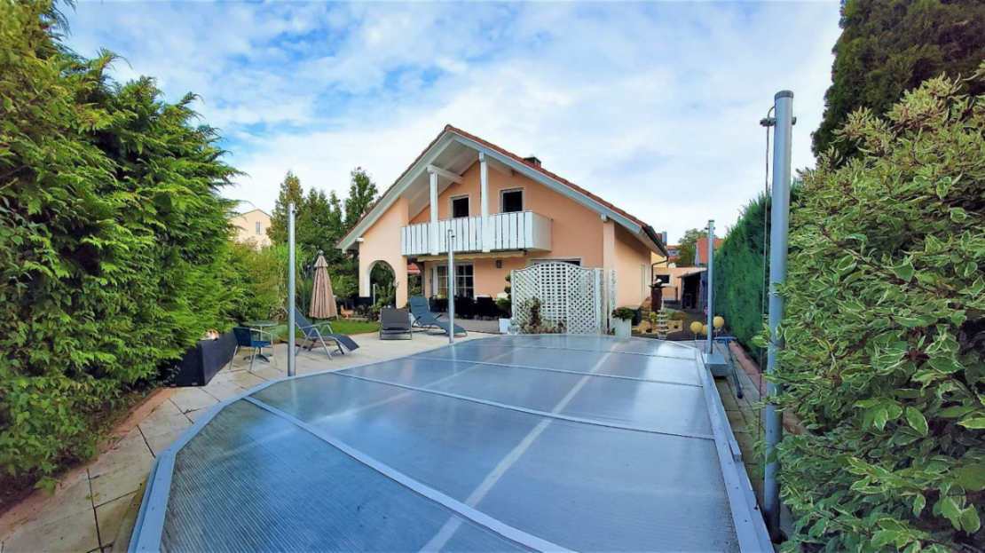 Der großzügige Außenpool mit integrierter Überdachung, der elektrisch steuerbar ist, lädt Jung und Alt zu unvergesslichen Momenten mit Familie und Freunden ein. Der Poolbereich mit reichlich Sitz- und Liegemöglichkeiten lädt förmlich zum Verweilen ein, und auch im Garten gibt es genügend Platz mit Grünflächen, die Sie individuell für sich und Ihre Familie nutzen können. (Spielturm, Trampolin, Außenküche und vieles mehr).
