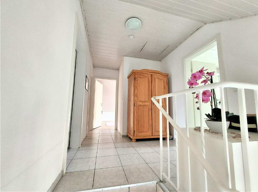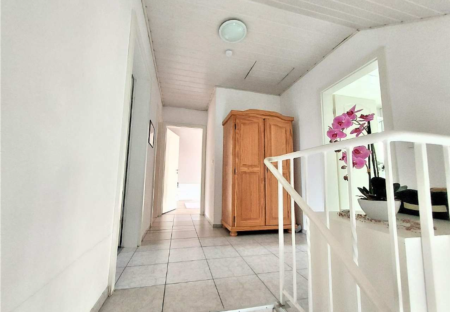 Der offene Wohnbereich führt in die separate Küche, das Büro oder Kinderzimmer sowie in den Keller und das Obergeschoss des Hauses. Im ersten Stock befindet sich ein geräumiger Flur mit viel Stauraum, wie z.B. einem Kleiderschrank, Schrank etc. Ein Badezimmer mit Dusche und Badewanne sowie 3 weitere Schlafzimmer erstrecken sich über die erste Etage.
