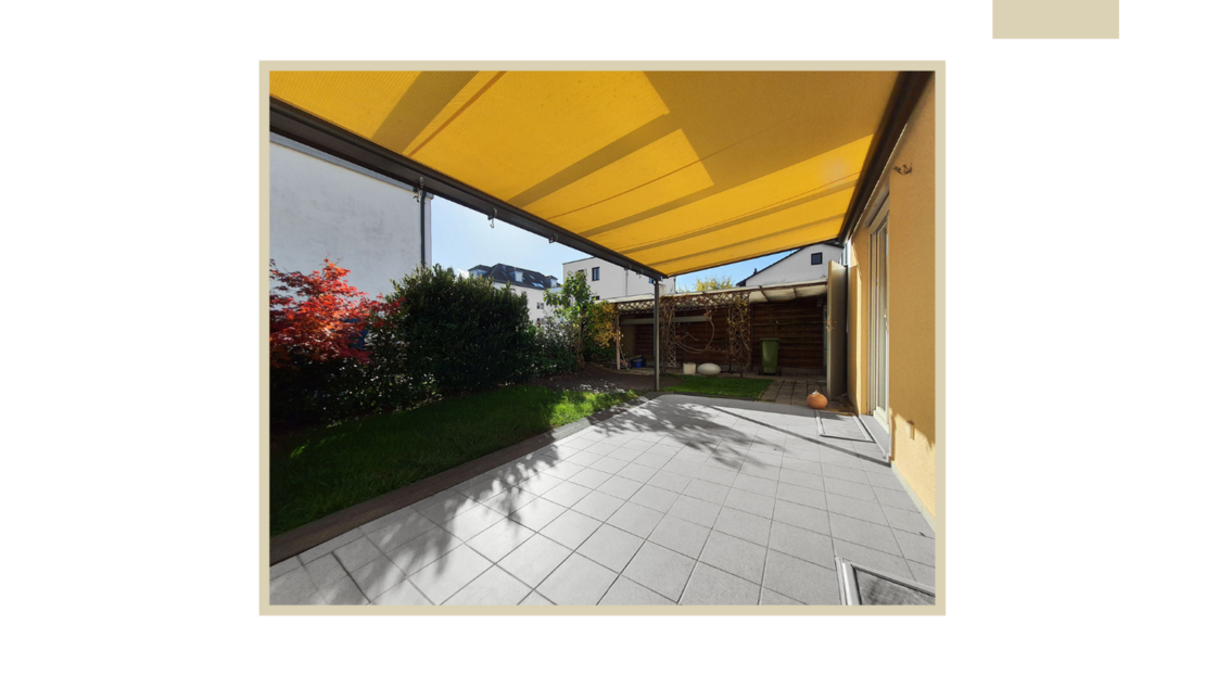 Die Terrasse ist mit einer 2013 installierten Überdachung ausgestattet, inklusive elektrischer Markise sowie teilweise integrierten Fliegengittern an den Fenstern.